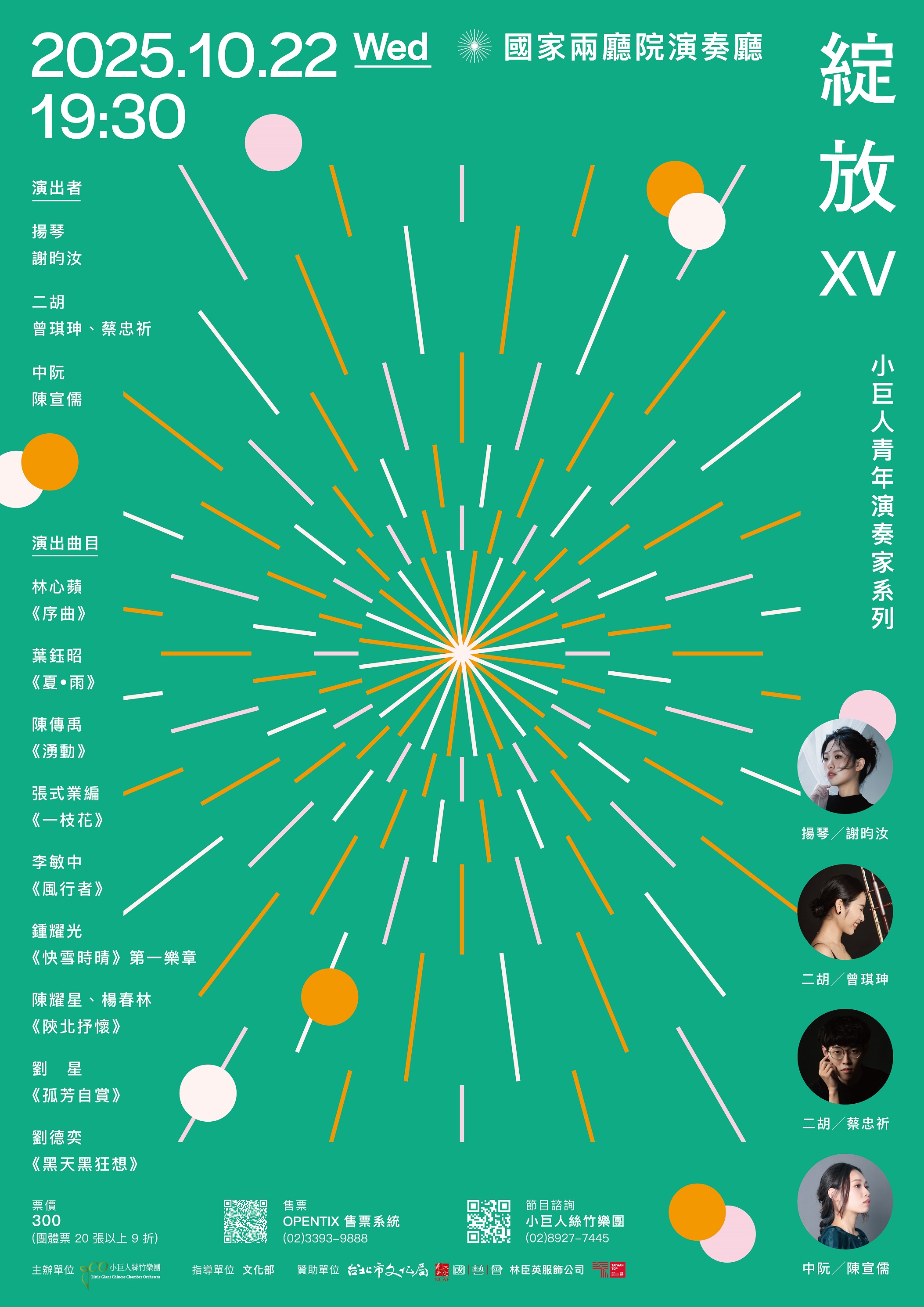 演出者: 揚琴/謝昀汝 二胡/曾琪珅、蔡忠祈 中阮/陳宣儒 演出曲目: 林心蘋:《序曲》 葉鈺昭:《夏•雨》 陳傳禹:《湧動》 張式業編:《一枝花》 李敏中:《風行者》 鍾耀光:《快雪時晴》第一樂章 陳耀星、楊春林:《陝北抒懷》 劉 星:《孤芳自賞》 劉德奕:《黑天黑狂想》 主辦單位:小巨人絲竹樂團 指導單位:文化部 贊助單位:臺北市政府文化局、財團法人國家文化藝術基金會、林臣英服飾公司 2025 TAIWAN TOP 演藝團隊