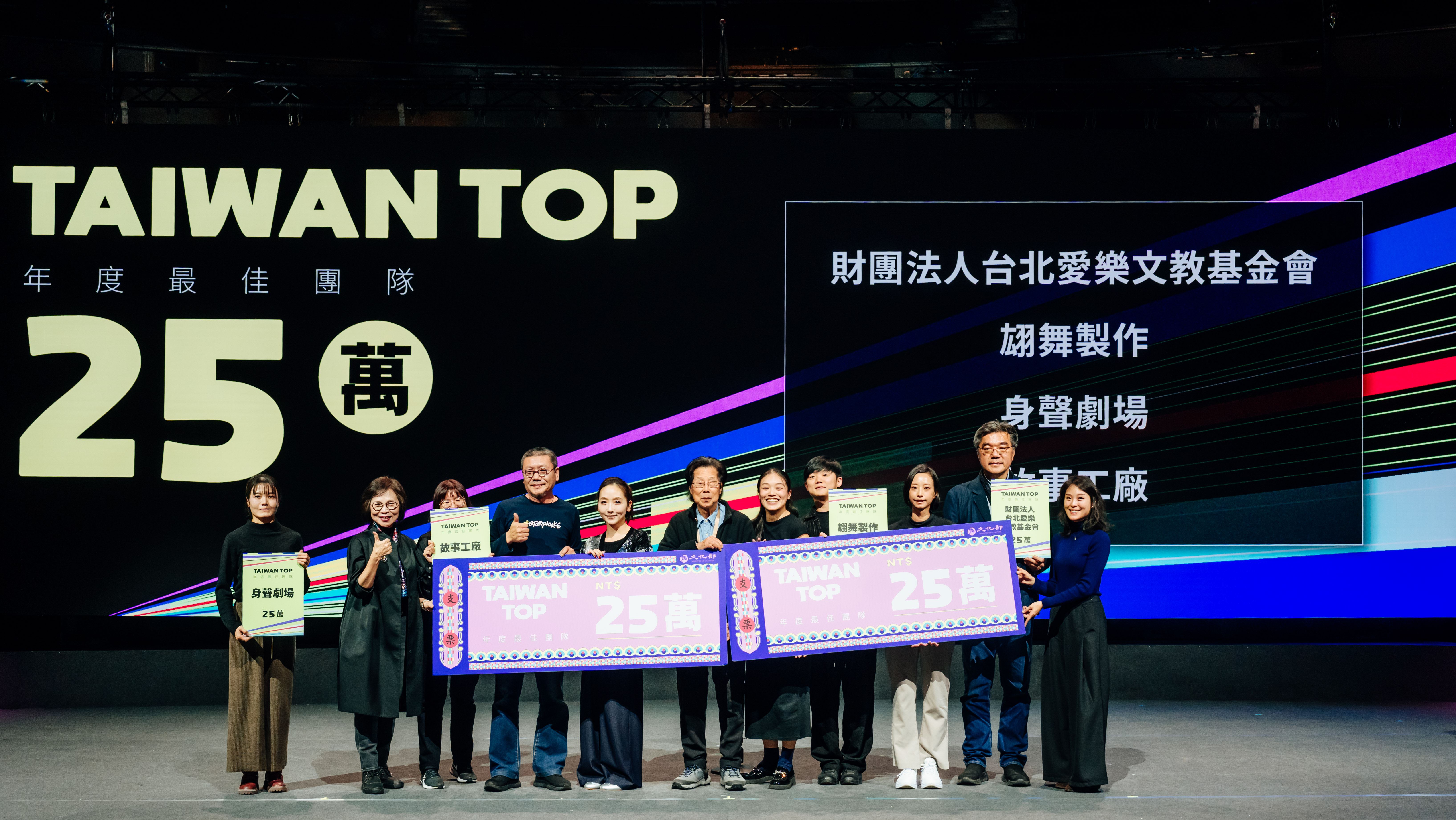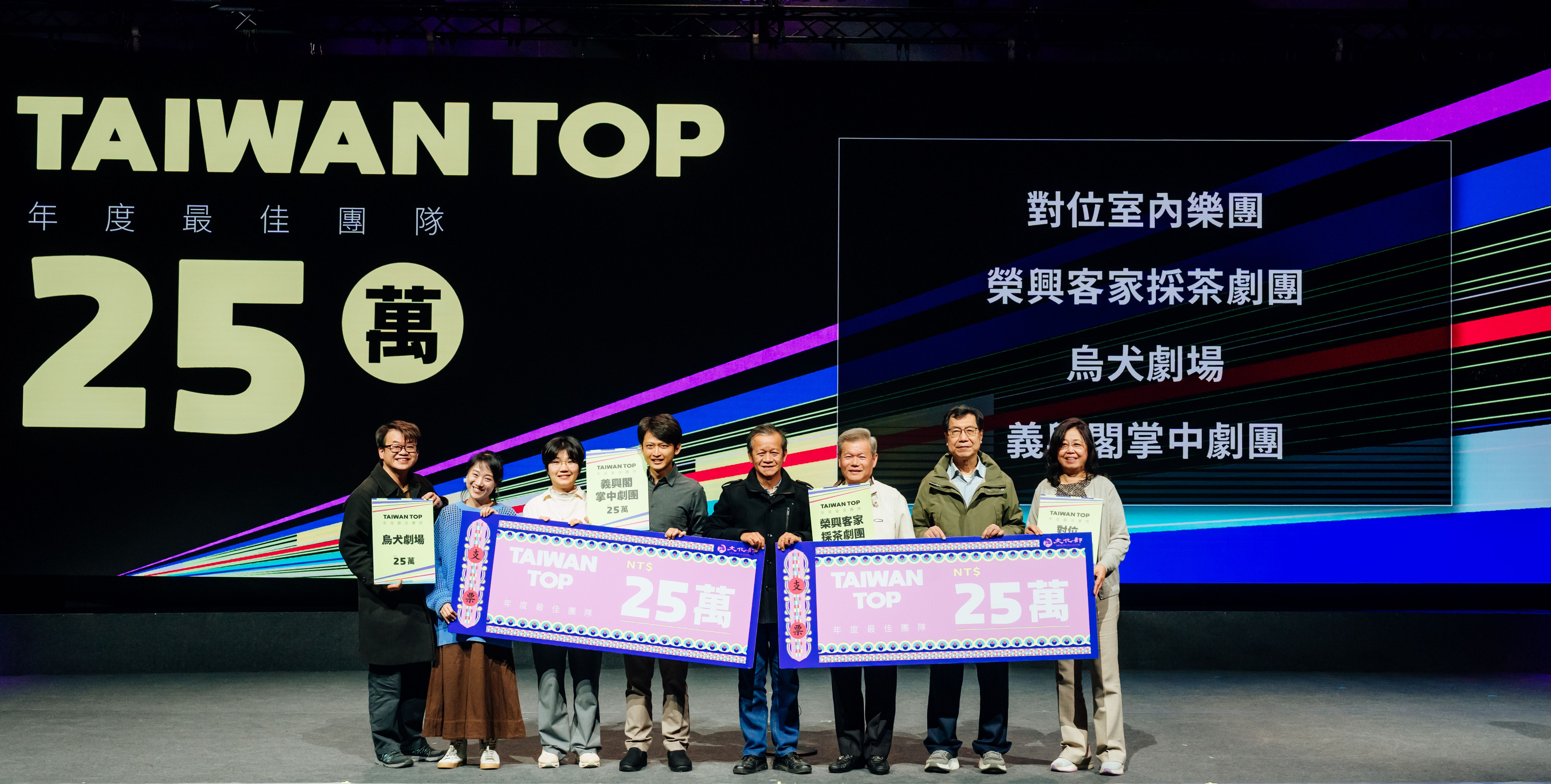 獲選團隊包含高雄市管樂團、驫舞劇場、臺北木偶劇團、河床劇團4團各獲得「Taiwan Top年度最佳團隊」50萬元獎勵金;對位室內樂團、翃舞製作、身聲劇場、榮興客家採茶劇團、財團法人台北愛樂文教基金會、微光製造、義興閣掌中劇團、FOCASA馬戲團、烏犬劇場、故事工廠、薪傳歌仔戲劇團、唱歌集音樂劇場12組團隊,各獲得「Taiwan Top年度最佳團隊」25萬元獎勵金。